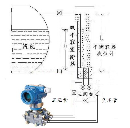 在正常工況下,鍋爐汽包內(nèi)的水位無(wú)法直接測(cè)量,為此多采用引出管測(cè)量法。但其弊病是引出管與汽包的溫度差異大,故水的密度與汽包內(nèi)差異大,從而造成一定的測(cè)量誤差。采用雙室平衡容器是因?yàn)槠湓诠ぷ鬟^(guò)程中,飽和蒸汽在室中凝結(jié)釋放熱量,對(duì)其中正壓補(bǔ)償管和負(fù)壓補(bǔ)償管加熱,并且平衡容器外層加以足夠的保護(hù)層。減少了熱量損失,使平衡容器的溫度接近于汽包內(nèi)的溫度。從而使正壓補(bǔ)償管及負(fù)壓管內(nèi)水的密度在任何工況下都近似等于汽包內(nèi)水的密度;又由于正確的選擇正壓補(bǔ)償管的高度,在汽包水位一定時(shí),使汽包內(nèi)的壓力無(wú)論如何變化,正壓補(bǔ)償管的壓力與負(fù)壓管的壓力變化值均相等,因此雙室平衡容器輸出的差壓不變,即低置水位表指示的水位不變。一旦汽包內(nèi)水位發(fā)生變化,則平衡容器輸出的差壓也隨之線(xiàn)性變化,所以低置水位指示可以適時(shí)顯示汽包內(nèi)的水位。